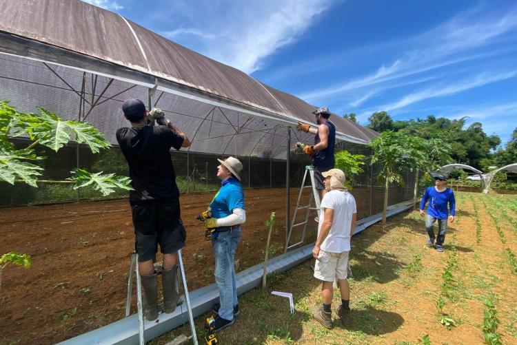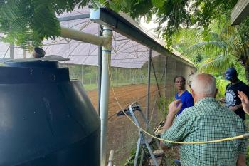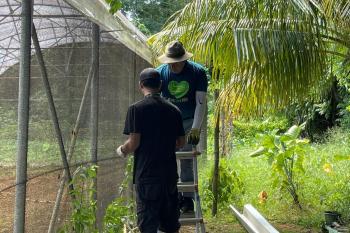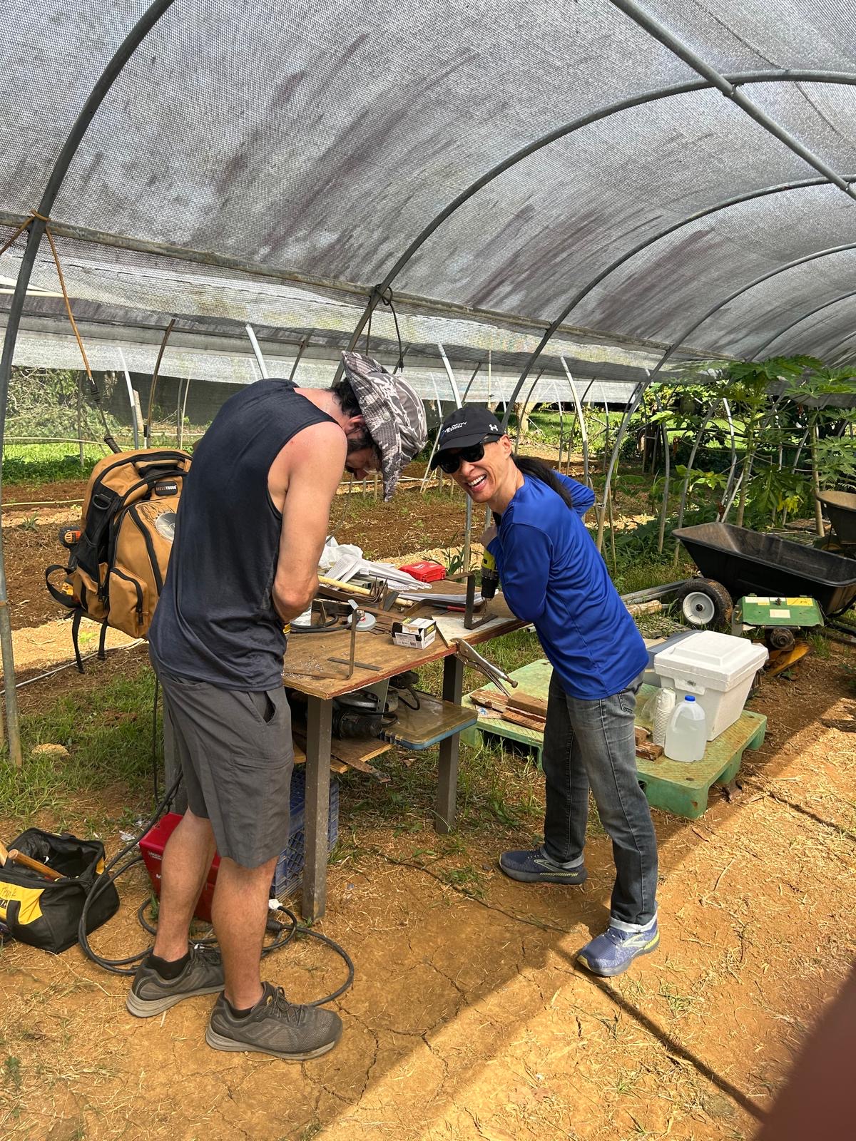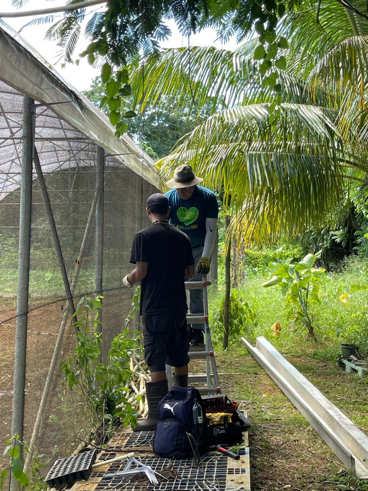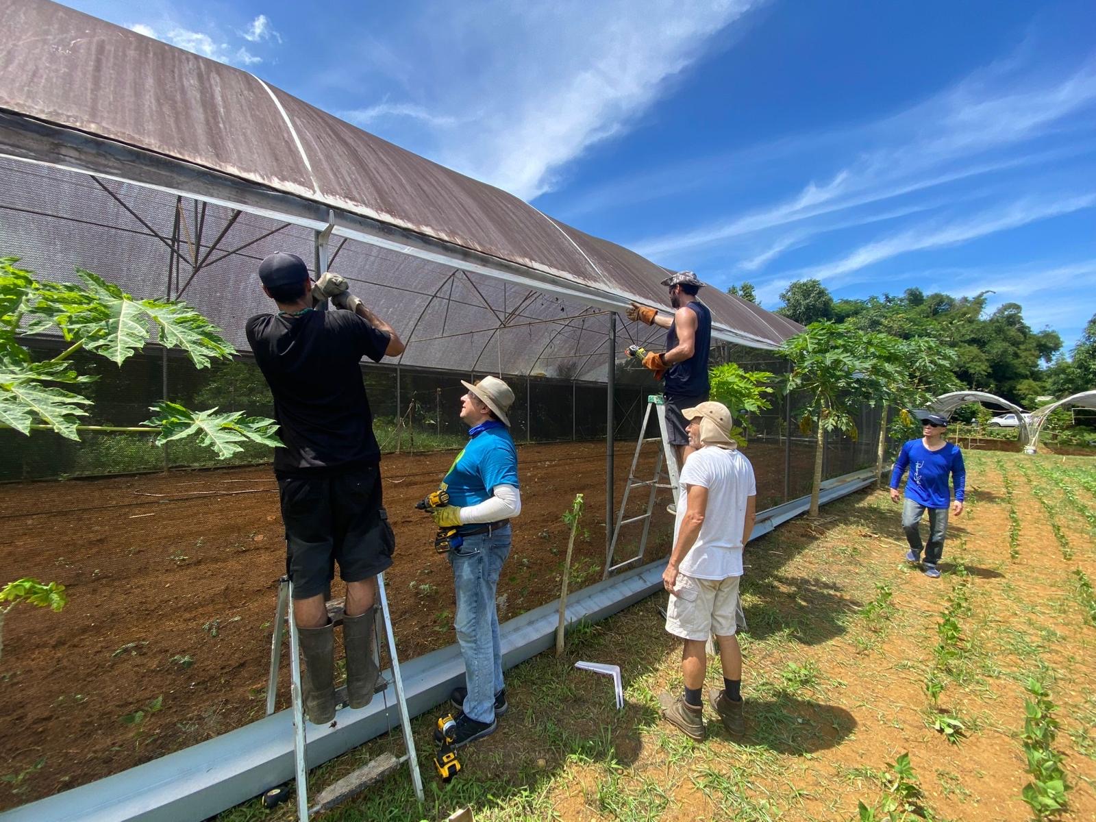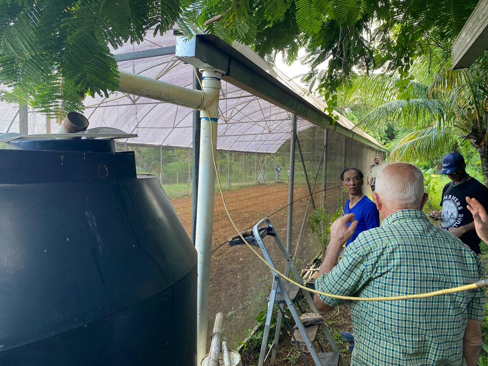 That’s when the Puerto Rico I Love You brigade, together with QTC International, stepped in. We replaced, repaired, and reinstalled his rainwater capture drains, connecting them to cisterns. We rebuilt the gutter system, and irrigation, patched up holes in his greenhouse netting and even helped cut down heavy branches that would have been impossible for him alone.